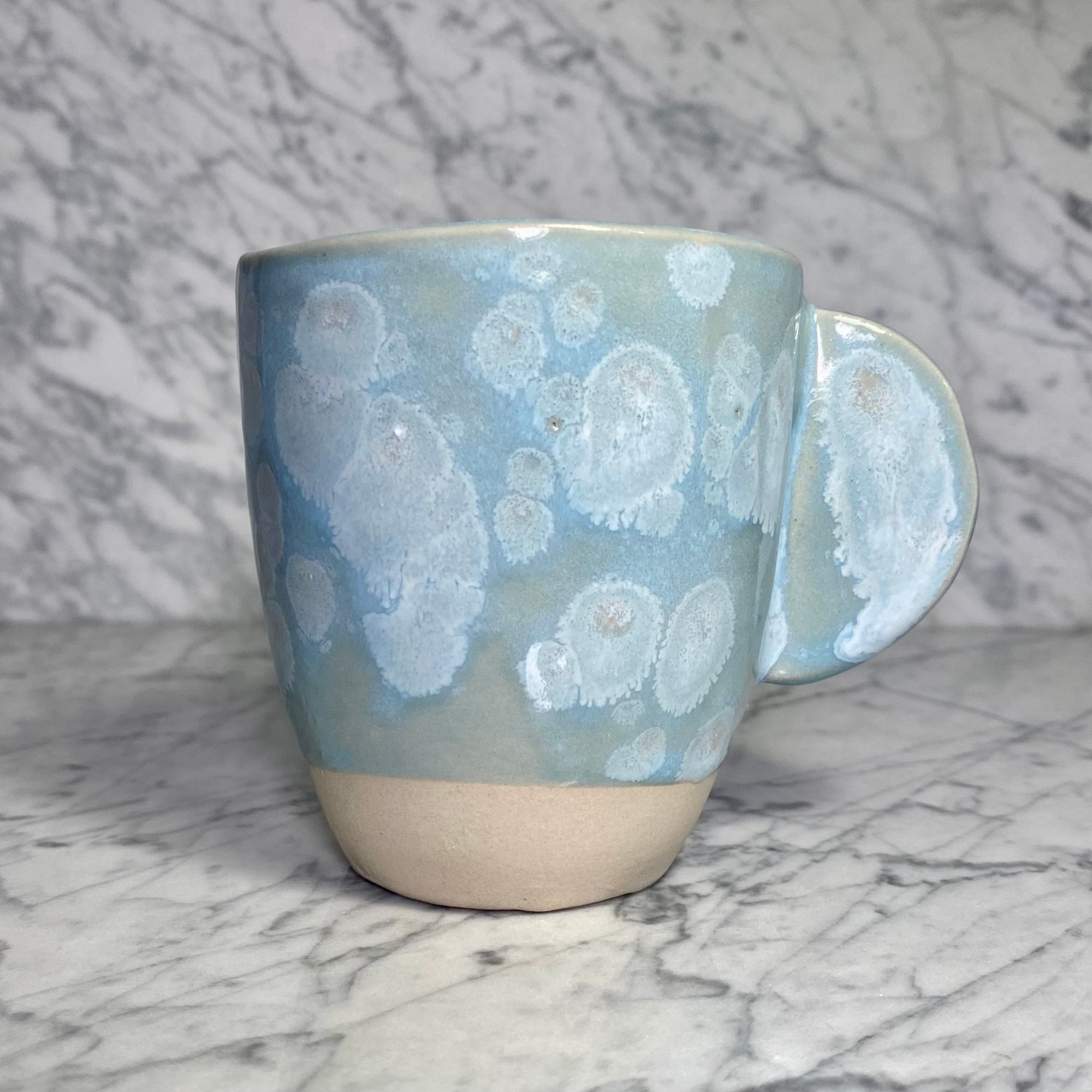 Enjoy your morning cup of coffee in this light blue mug with white splatters. Its funky handle will stand out in your collection. Height: 9cm Diameter: 7,5cm